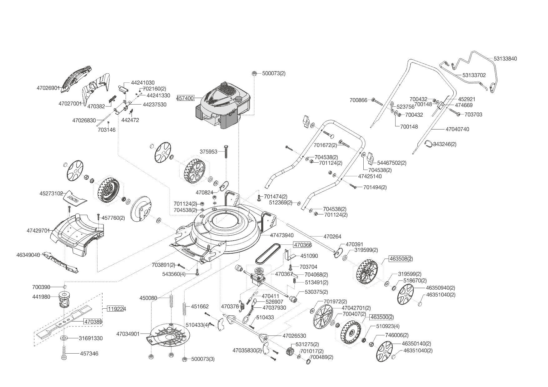- Pohon předních kol: Usnadňuje otáčení a manévrování se sekačkou.