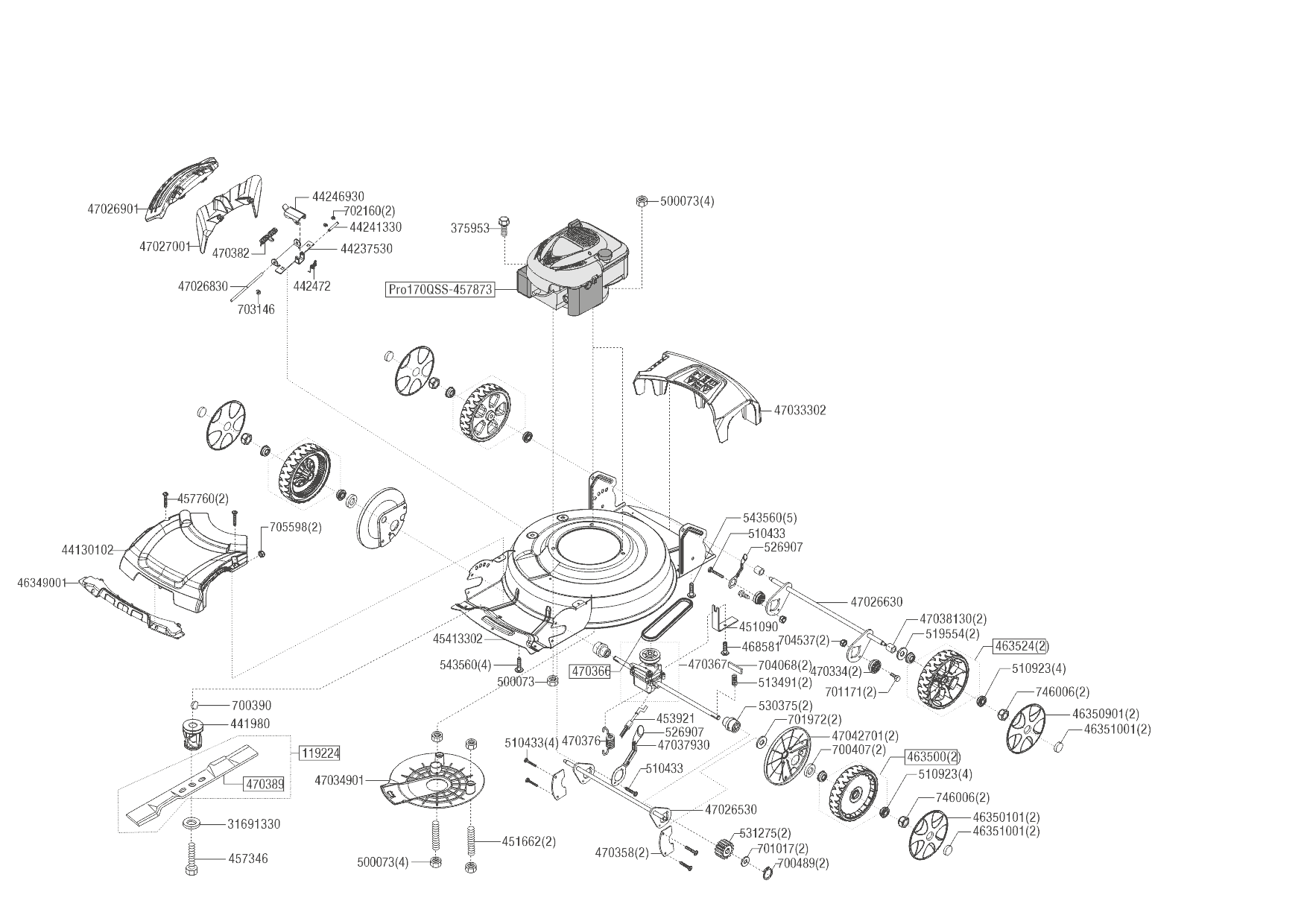 Sekačka se záběrem 46 cm je poháněna motorem AL-KO Pro 170 QSS (2.6 kW, 166 ccm). Unikátní je pohon předních kol (1 rychlost, cca 3.5 km/h), který usnadňuje otáčení a manévrování při mulčování okolo stromů a keřů. Kromě mulčování nabízí i možnost bočního výhozu. Výšku sečení lze nastavit individuálně pro každé kolo ve 4 úrovních od 30 do 85 mm (parametry uvádí 30-80mm). Ergonomicky tvarovaná řídítka a velká XL kola (220/205 mm) šetrná k trávníku zajišťují pohodlnou práci.
