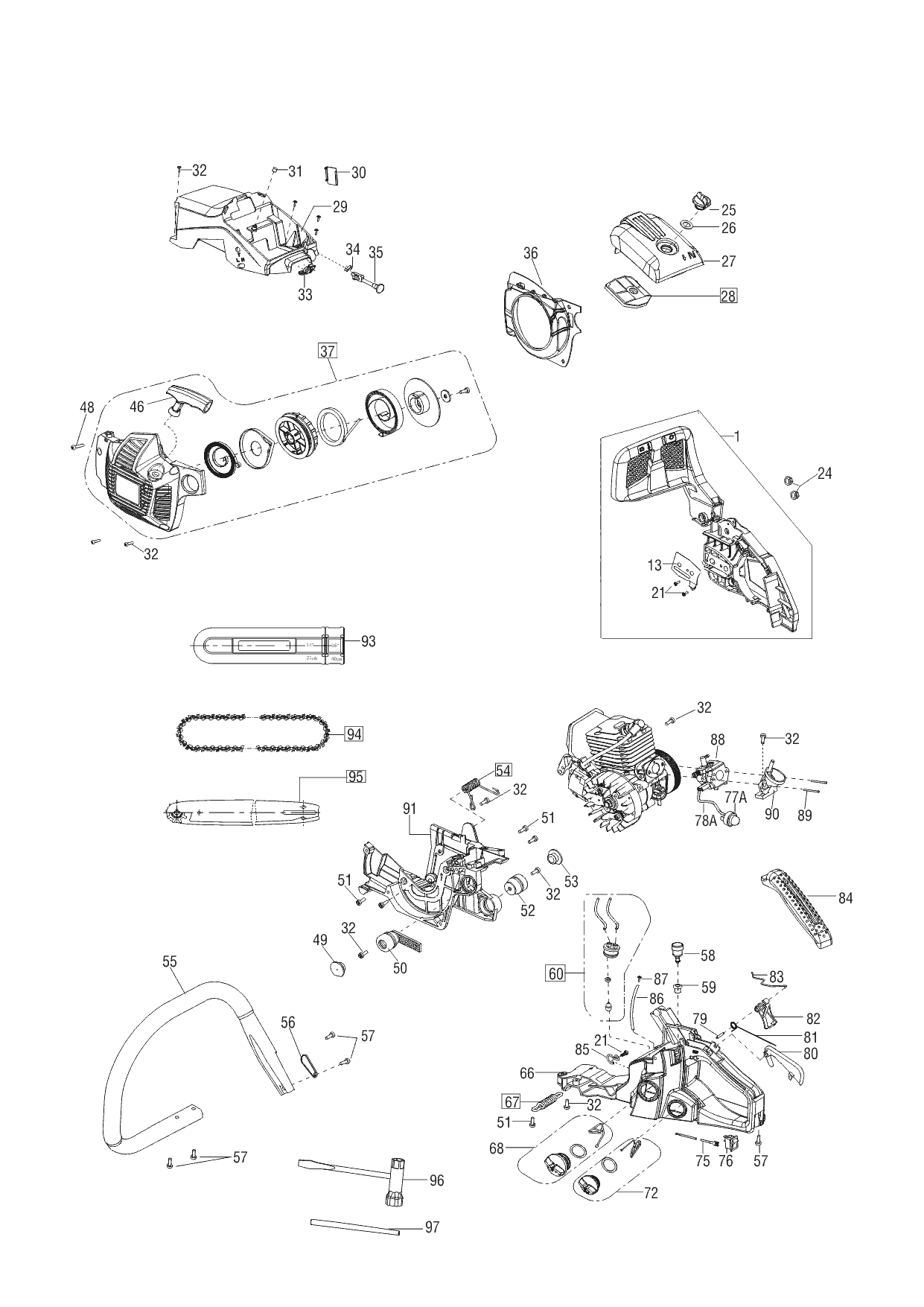 - Snadná údržba: Vzduchový filtr přístupný bez nářadí, boční napínání řetězu, uzávěry nádrží bez nářadí.