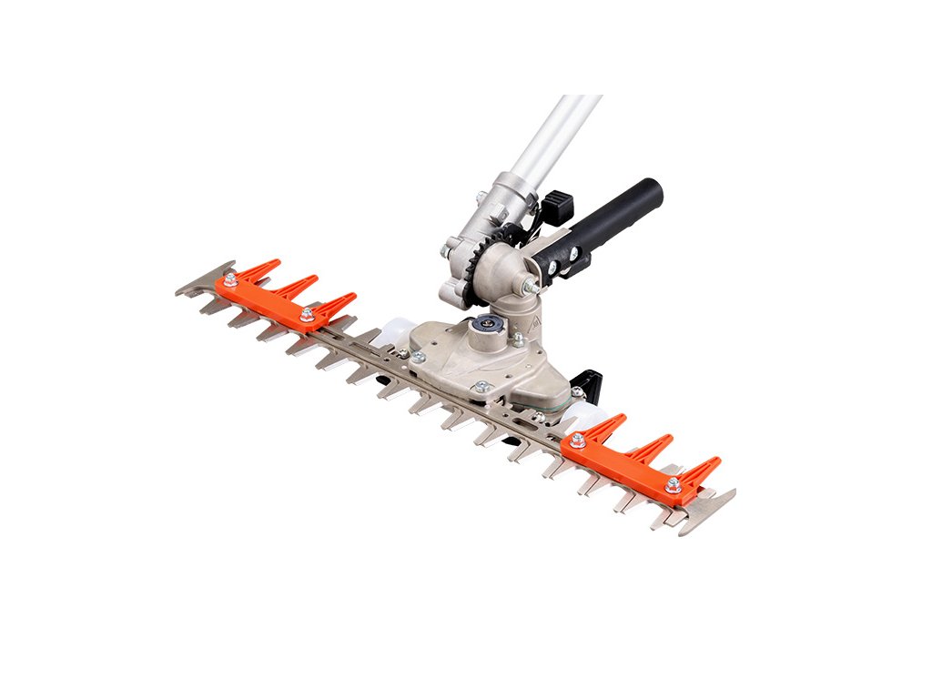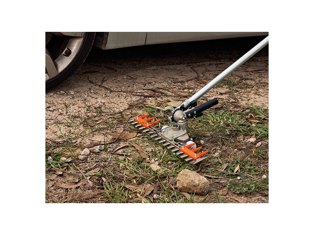 Jeho speciální řezací hlava ve tvaru T pracuje na principu kmitajících nožů (délka lišty 464 mm, rozteč zubů 30 mm) a díky tomu neodhazuje žádné předměty. Umožňuje rychlé a čisté zastřižení trávy těsně u okrajů, pod ploty apod. Hlava je umístěna na 2 kolečkách a kluzné desce, což zajišťuje plynulý pohyb po rovném i nerovném povrchu. Jednoduché nastavení úhlu umožňuje přizpůsobení různým situacím.